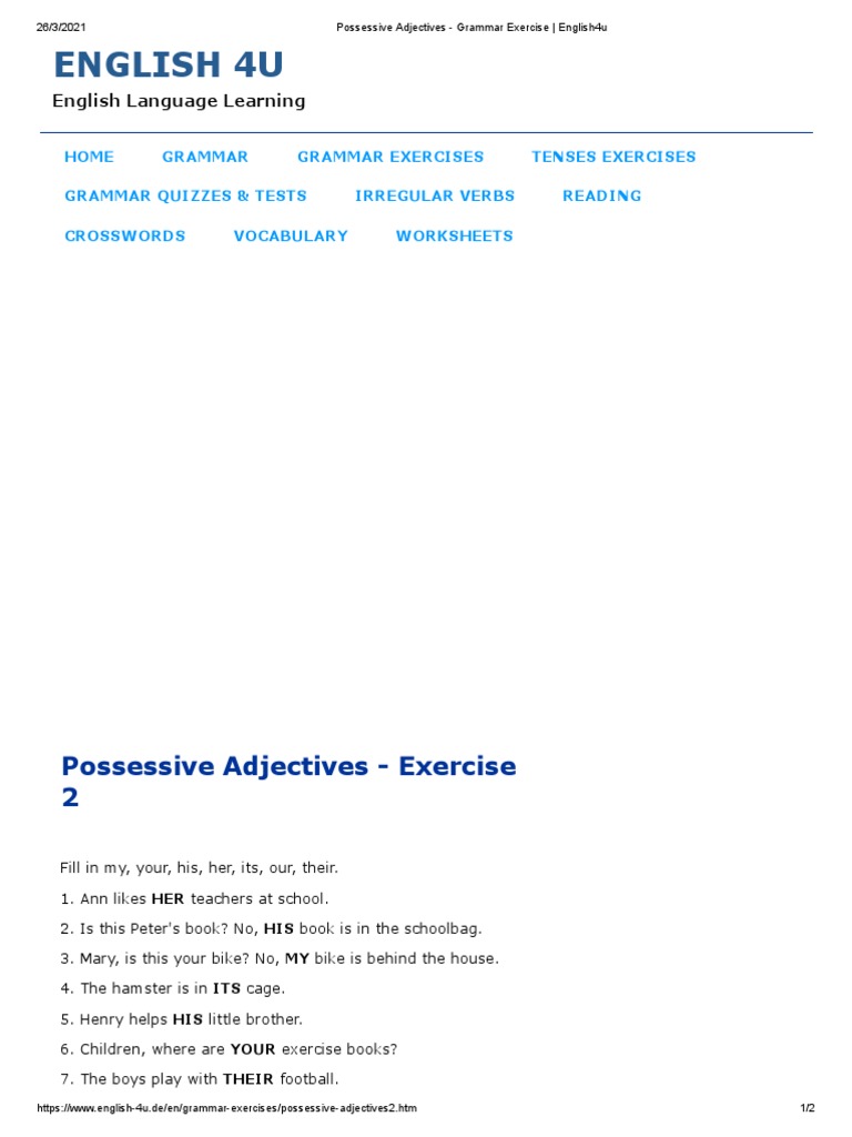 Possessive Adjectives English Grammar Exercise English4u Pdf