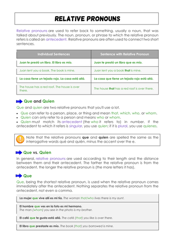 Spanish Relative Pronouns Grammar Notes Exercices And Translations Teaching Resources
